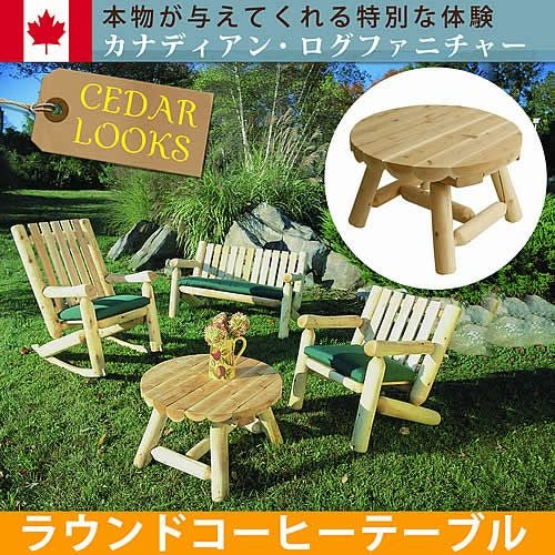 カナダのノーザンホワイトシダー専門木工家具メーカーCedar Looksからの直輸入、ラウンドコーヒーテーブルです。北米大陸東北部に自生する上質な天然杉丸太で造られており、ワイルドな風合いが自然にマッチします。ホワイトシダー独自の抗菌作用で害虫が付きにくく、腐りにくいのが特徴です。天然杉丸太材の質感を充分に味わって戴くために、ナチュラル(無塗装品)でお届け致します。年月が経てば、やがてシルバーグレーに変化します。塗装を施せば耐久性がさらにアップし、カラフルな表情も楽しめます。(塗装は市販の屋外木部用ステイン系塗料をご使用下さい)