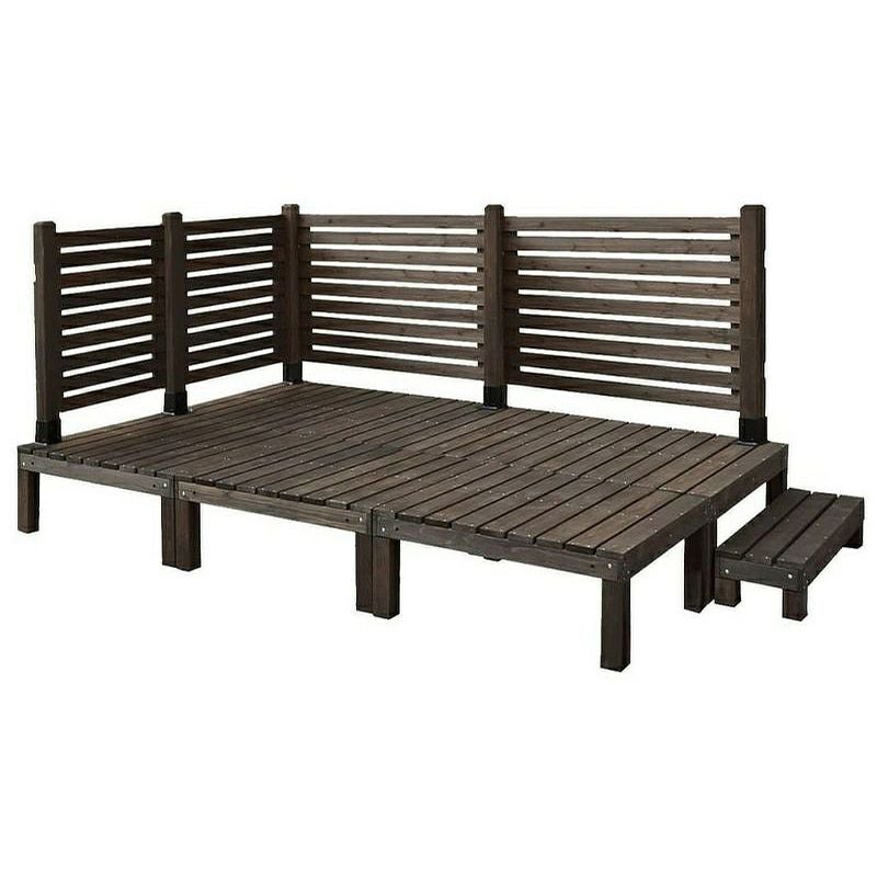 【サイズ】(90デッキ1台): 幅90×奥行90×高さ36.5cm 天板の厚み: 23mm (ステップ): 幅90×奥行30×高さ18.5cm /(フェンス120cm幅) 幅1270mm×奥行27mm×高さ790mm (フェンス72cm幅) 幅790mm×奥行27mm×高さ790mm / (ポール) 幅72mm×奥行72mm×高さ950mm (平地金具) 幅120mm×奥行120mm×高さ100mm