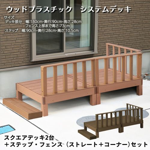 ■ 商品内容 : ウッドプラスチックデッキ(90×90 cm)2台 + ストレートフェンス 1枚 + コーナーフェンス 1組 + 専用ステップ1台 のセット商品です。