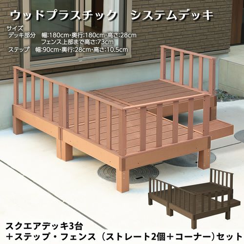 ■ 商品内容 : ウッドプラスチックデッキ(90×90 cm)3台 + ストレートフェンス 2枚 + コーナーフェンス 1組 + 専用ステップ1台 のセット商品です。