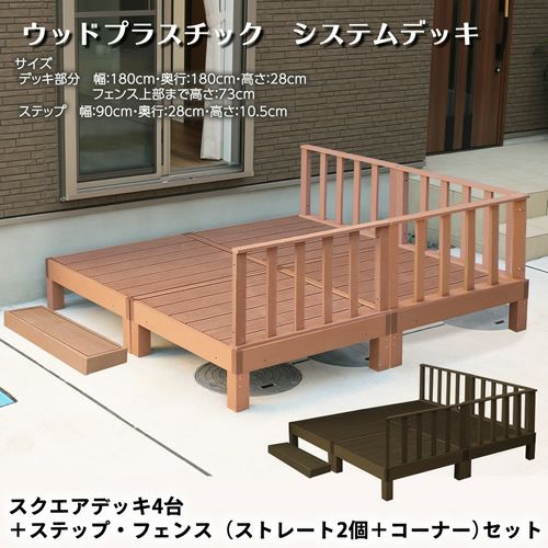 ■ 商品内容 : ウッドプラスチックデッキ(90×90 cm)4台 + ストレートフェンス 2枚 + コーナーフェンス 1組 + 専用ステップ1台 のセット商品です。