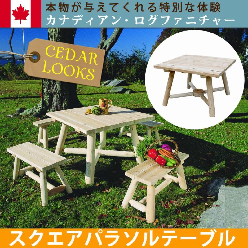 カナダのノーザンホワイトシダー専門木工家具メーカーCedar Looksからの直輸入、スクエアパラソルテーブルです。北米大陸東北部に自生する上質な天然杉丸太で造られており、ワイルドな風合いが自然にマッチします。ホワイトシダー独自の抗菌作用で害虫が付きにくく、腐りにくいのが特徴です。天然杉丸太材の質感を充分に味わって戴くために、ナチュラル(無塗装品)でお届け致します。年月が経てば、やがてシルバーグレーに変化します。塗装を施せば耐久性がさらにアップし、カラフルな表情も楽しめます。(塗装は市販の屋外木部用ステイン系塗料をご使用下さい)