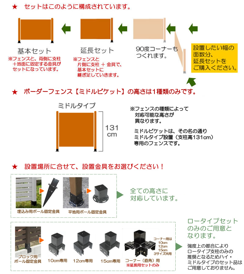 ▼ ボーダーフェンス ピケット ミドルタイプ <延長セット>