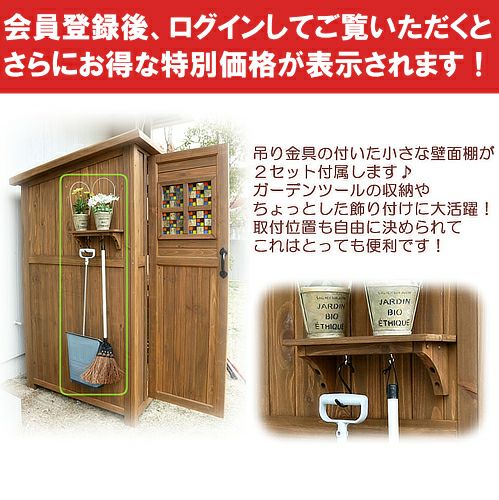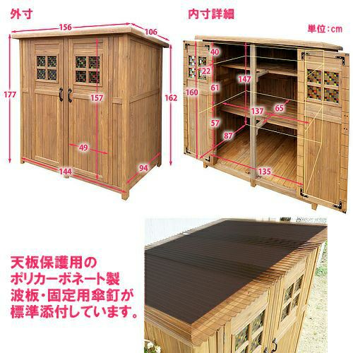 他の画像を見る ★天板取付用のポリカ製波板標準添付★ ビッグな収納庫 ポタジェモザイク 木製物置小屋(カントリーシェッド) <幅156×高さ177cm> ¥ 135,000 税込 人が入れるほどの大容量!ビッグでかわいい物置小屋です。当店のロングセラーです。 カートに入れる お気に入りに登録する